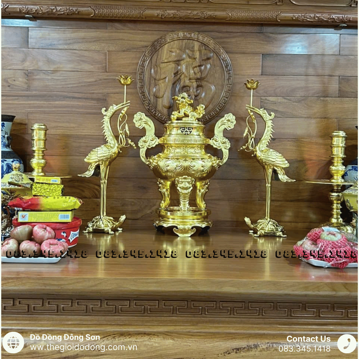 Bộ Lư Đồng 5 Món Mạ Vàng là một sản phẩm nghệ thuật thủ công tinh xảo, kết hợp giữa vẻ đẹp truyền thống của đồng và sự sang trọng của lớp mạ vàng cao cấp. Sản phẩm không chỉ là vật dụng để thờ cúng, mà còn là một món đồ trang trí cao cấp, thể hiện đẳng cấp và gu thẩm mỹ của gia chủ.