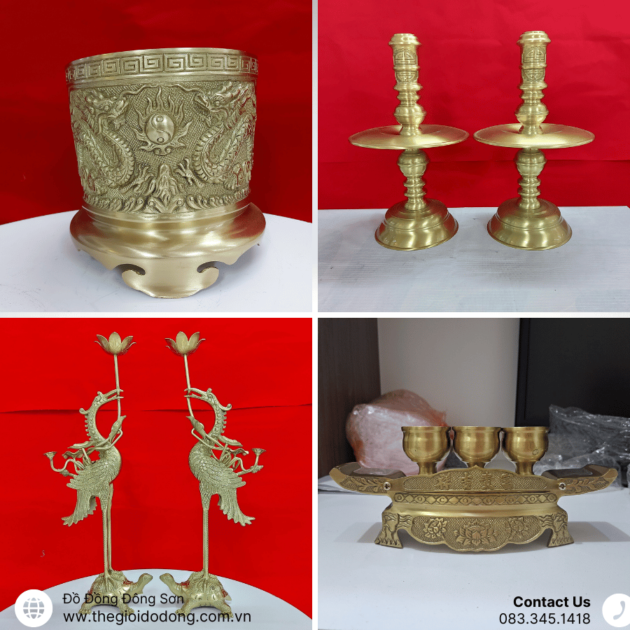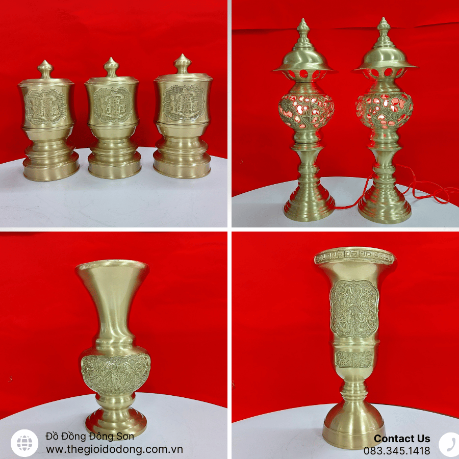 Bộ ngũ sự thờ gia tiên bằng đồng vàng cao cấp là đồ thờ linh thiêng tinh xảo với thiết kế độc đáo, giàu ý nghĩa rất được ưa chuộng. Tác phẩm được chế tạo kì công từ đồng nguyên chất với hoa văn đầy tinh tế cùng những nét chạm đúc công phu, đậm đà giá trị truyền thống. Sản phẩm được sử dụng bày biện trên ban thờ gia tiên mỗi gia đình với ý nghĩa thiêng liêng sâu sắc.