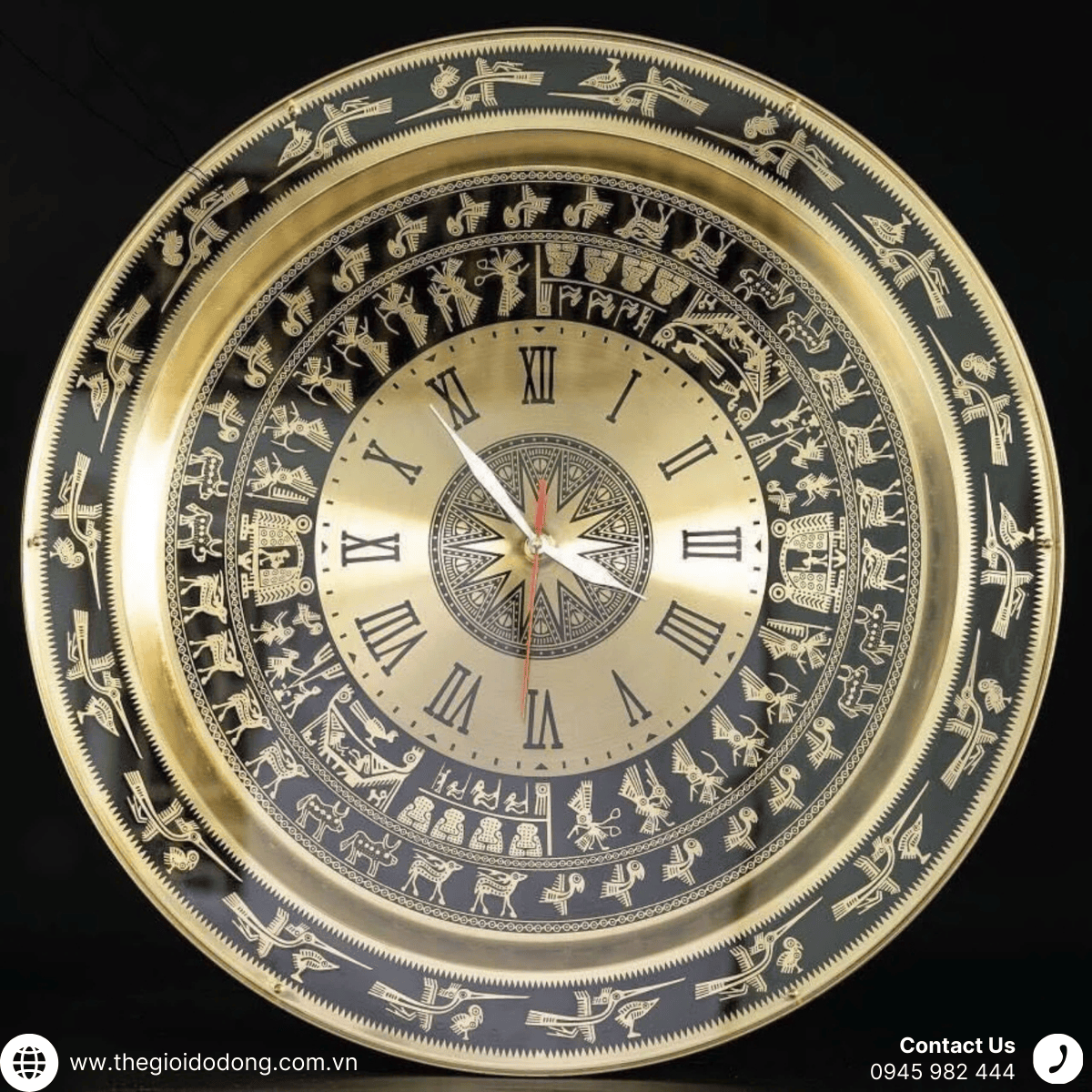 Xung quanh trọng tâm là hoa văn là dã số từ 1 đến 12 khung giờ của đồng hồ làm sản phẩm đồng hồ quà tặng mặt trống đồng sinh động và sang trọng hơn.