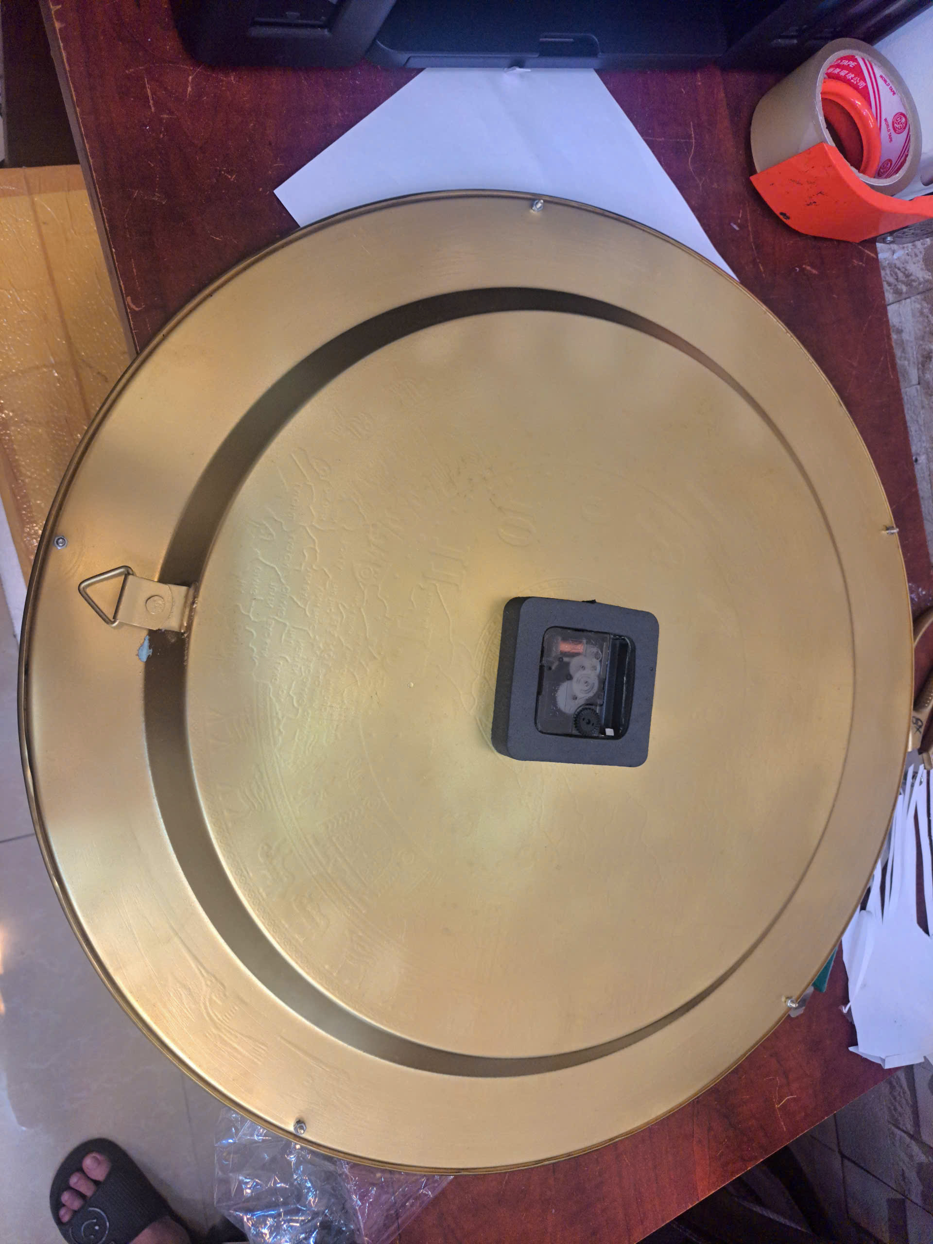 Mặt sau đồng hồ trống đồng treo tường có thiết kế đảm bảo tính thẩm mỹ trên nền đồng bóng mượt, có móc treo để cố định đồng lên tường đảm bảo thuận tiện khi lắp đặt.