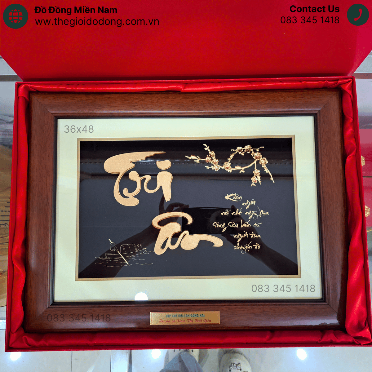 Chữ thư pháp “Tri Ân” nổi bật, dát vàng 24K thủ công tinh xảo.
