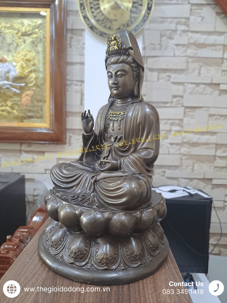 Tượng Quan Thế Âm Bồ Tát được làm từ đồng nguyên chất, trải qua quy trình đúc đồng thủ công truyền thống cầu kỳ, kết hợp với kỹ thuật hiện đại để tạo nên những đường nét tinh tế, sắc sảo. Bề mặt tượng được xử lý kỹ lưỡng, phủ lớp bảo vệ chống oxi hóa, giữ nguyên vẻ đẹp bền lâu với thời gian. Mỗi chi tiết nhỏ nhất trên tượng đều được trau chuốt tỉ mỉ, thể hiện sự tôn kính và lòng thành tâm của người nghệ nhân.